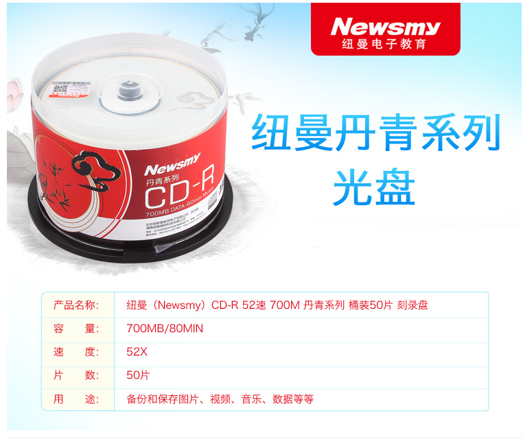 商品名稱:紐曼(Newsmy)CD-R光盤/刻錄盤 丹青系列 52速700M 桶裝50片空白光盤