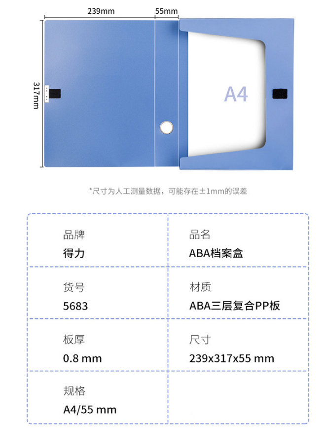 得力(deli)檔案盒A4塑料加厚文件盒辦公用品財(cái)務(wù)票據(jù)收納冊 得力(deli)中端款側(cè)寬55mm/5683 單個(gè)裝