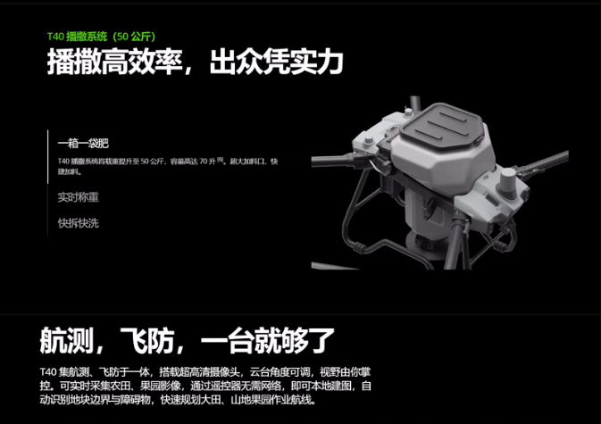 商品名稱:大疆(DJI)T40 無人機 50公斤播撒載重有源相控陣雷達智圖雙目視覺感知植保機
