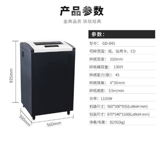 商品名稱:金典(GOLDEN) GD-845 碎紙機 4級保密連碎24小時單次45張130L可碎紙卡光盤CD